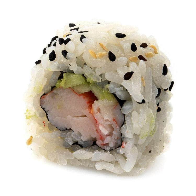 Roll con polpa di granchio, avocado, cetrioli, maionese e tobiko.