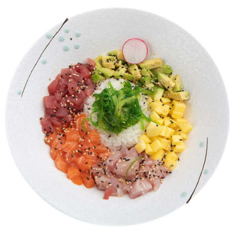 Bowl con salmone, tonno, orata e frutta esotica.