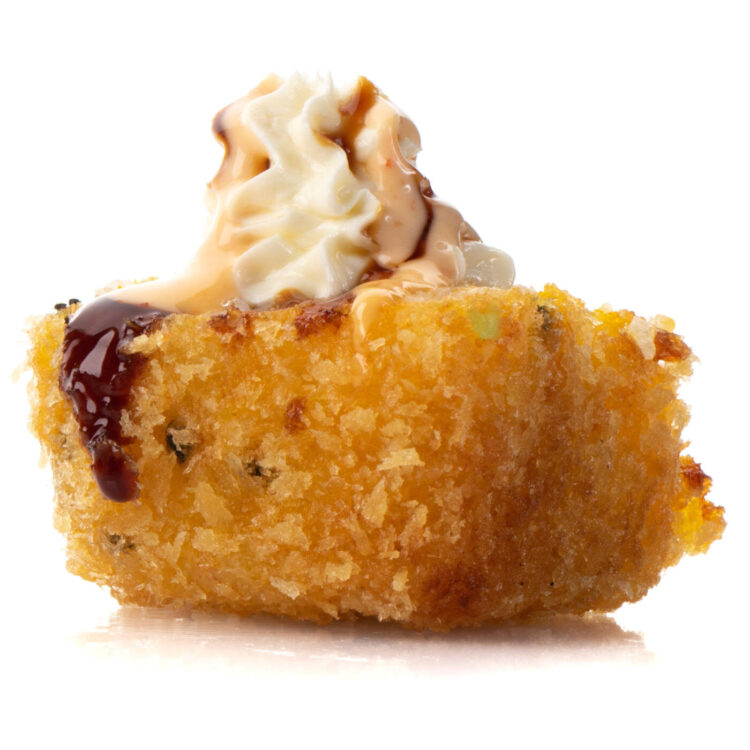 Roll di tonno con philadelphia, impanato nel panko, salsa teriyaki e mayo piccante.