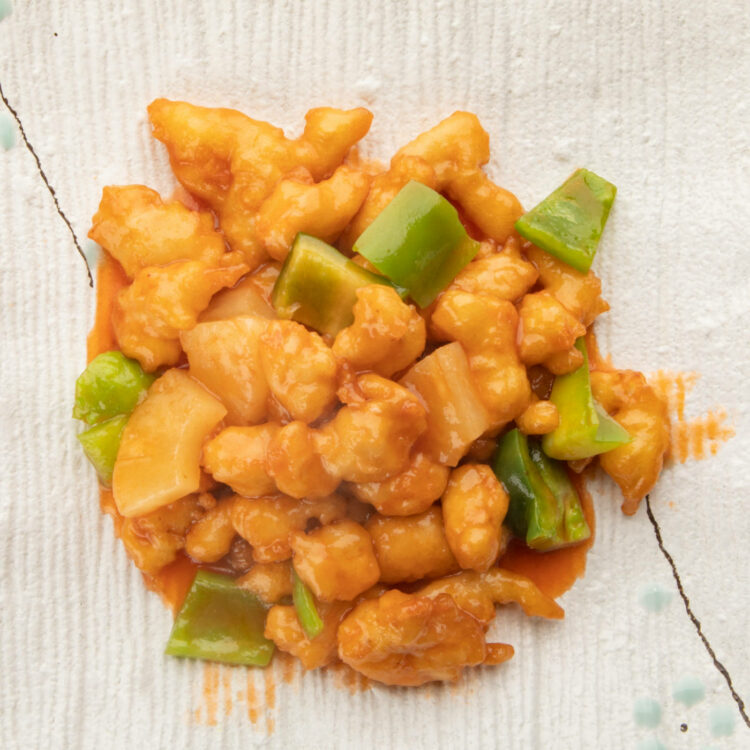 Pezzetti di pollo fritti e conditi in salsa agrodolce.