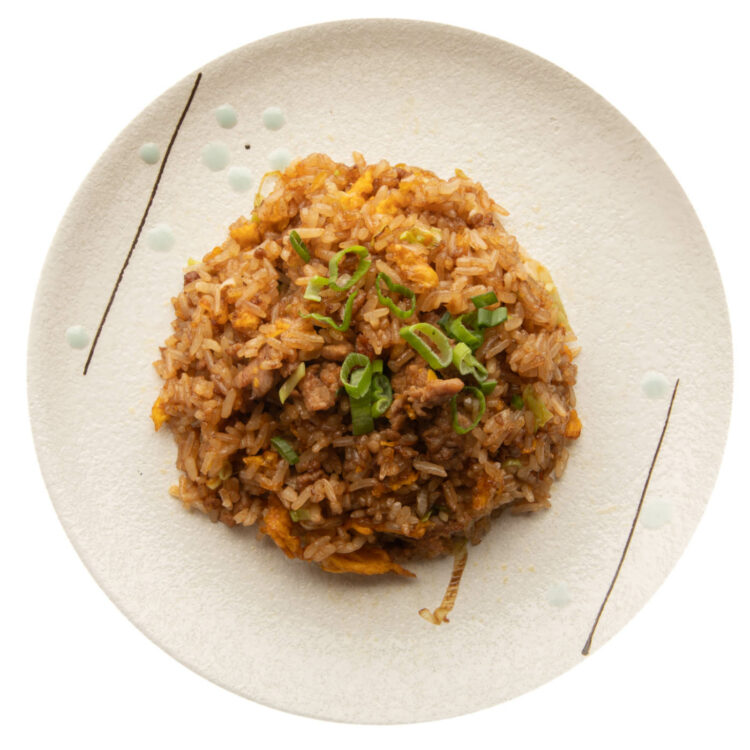 Riso saltato con manzo ed erba cipollina.