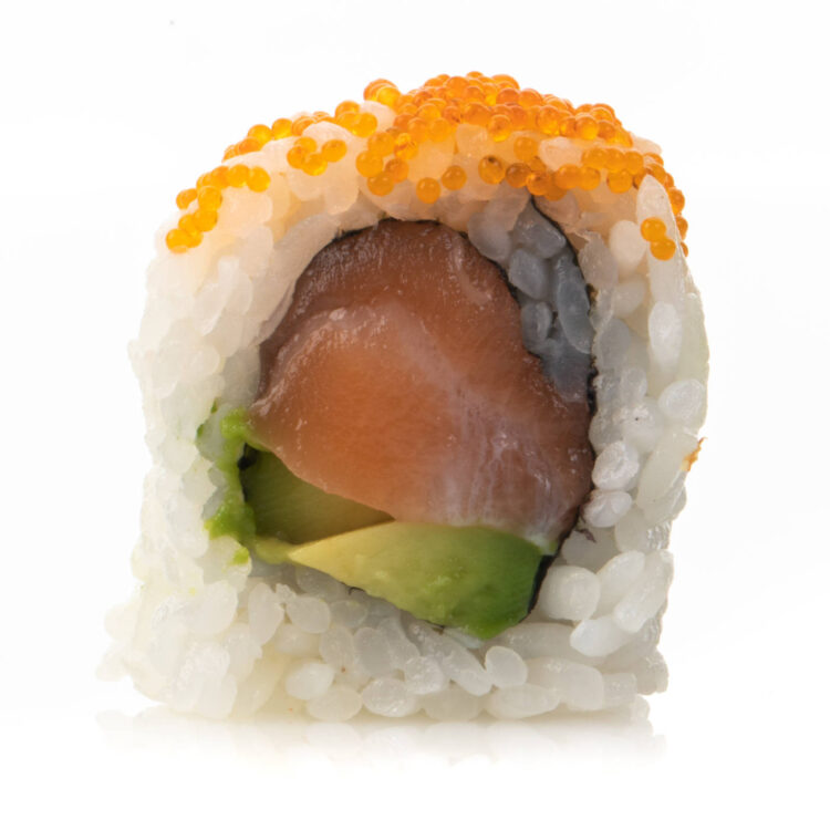 Uramaki di salmone crudo, avocado e tobiko.