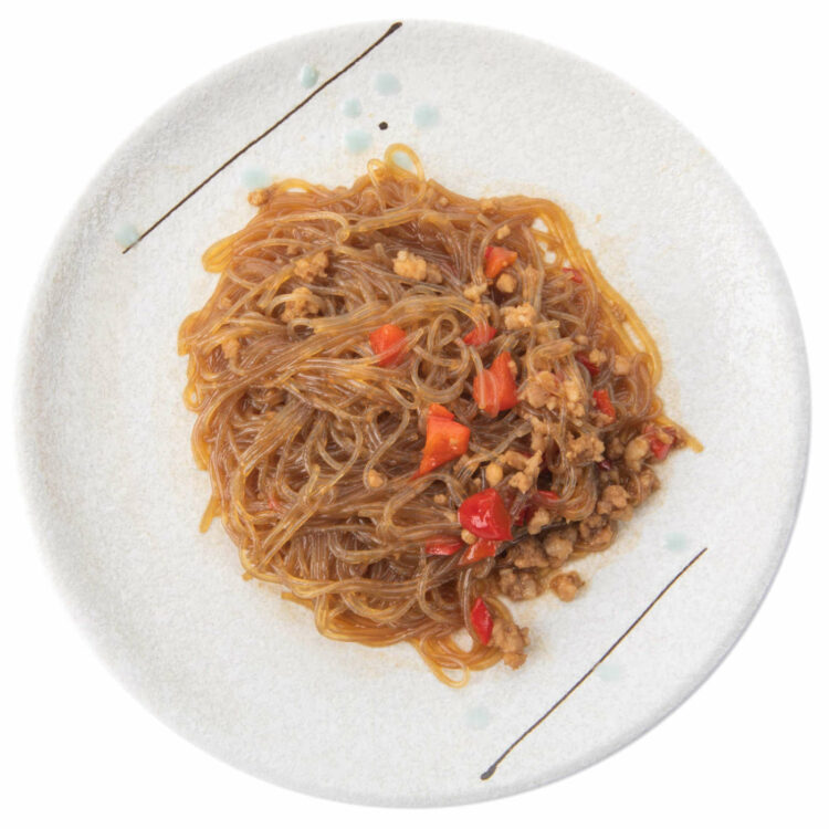 Noodles cinesi trasparenti con carne piccante.
