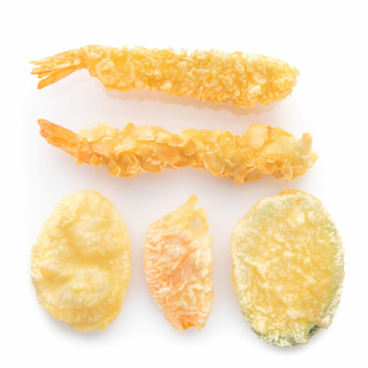 Tempura di gamberoni, spigola, ricciola, verdure.